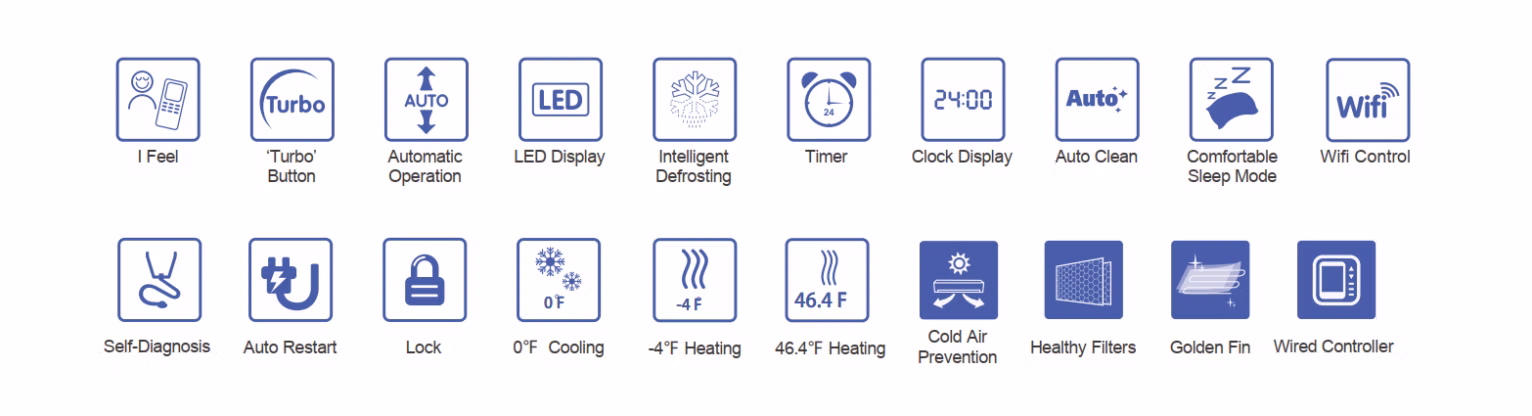 ULTRA HEATING: 80% heating capacity at -31 degree Fahrenheit for 30,000 and 36,000 BTU models, 80% at -22 degree Fahrenheit for 9,000 – 24,000 BTU models.